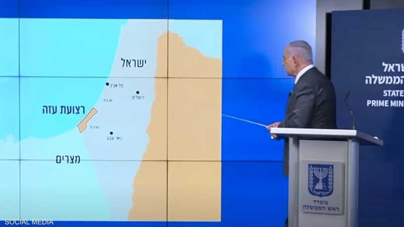 وكان نتنياهو يتحدث خلال مقطع فيديو عن أهمية السيطرة على محور فيلادلفيا الحدودي بين قطاع غزة ومصر، لكن خلو الخريطة من أي إشارة إلى الضفة كان لافتا.