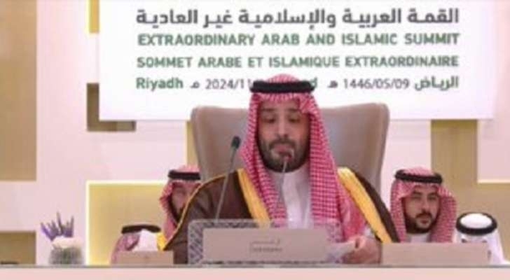 اكد ولي العهد السعودي محمد بن سلمان في افتتاح اعمال القمة العربية الاسلامية حول غزة ولبنان، أننا "ندين العمليات العسكرية التي تستهدف أراضي لبنان ونرفض انتهاك سيادته، ونجدد رفضنا الإبادة الجماعية التي ترتكبها إسرائيل ضد الشعب الفلسطيني الشقيق".