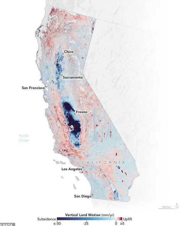 وفي أحدث خريطة للولاية، كشف علماء ناسا عن الأماكن التي تغرق فيها الأرض أكثر، حيث تم إبراز المناطق التي تغرق فيها كاليفورنيا بشكل أعمق بدرجات داكنة من اللون الأزرق.
