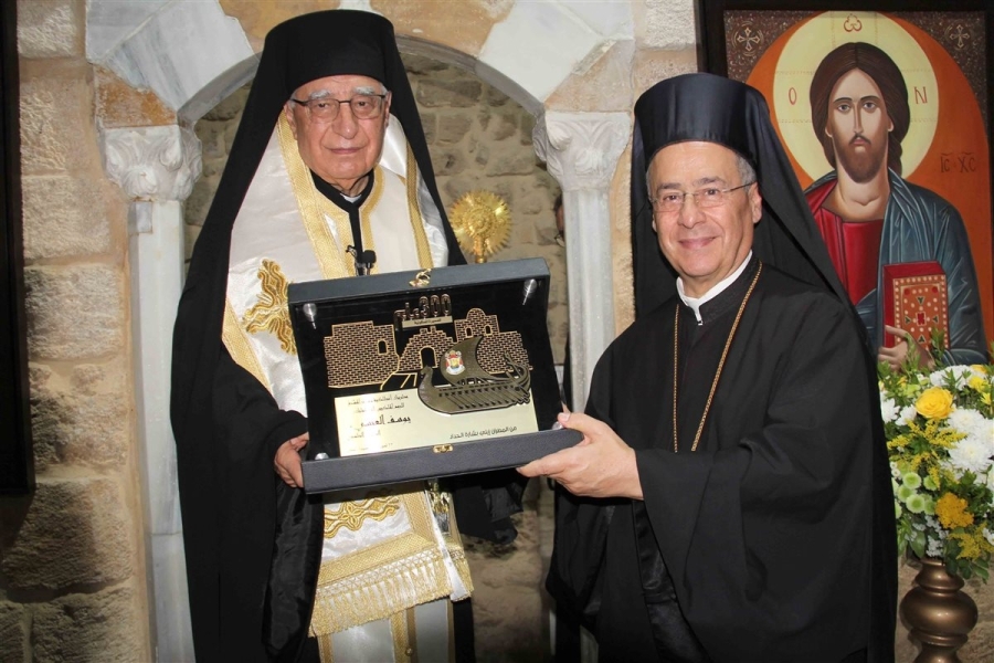 وفي الختام قدم المطران حداد للبطريرك العبسي درع صيدا مدينة السلام والمحبة . بعد ذلك تقبل البطريرك العبسي بمشاركة المطارنة التهاني في صالون مطرانية صيدا