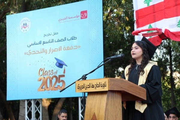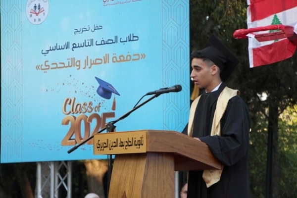 برعاية وحضور رئيسة مؤسسة الحريري للتنمية البشرية المستدامة السيدة بهية الحريري احتفلت ثانوية الحاج بهاء الدين الحريري بتخريج الدفعة الثانية والعشرين من طلاب الصف التاسع الأساسي "دفعة الإصرار والتحدي – 2025"، وذلك في باحة ملعب الثانوية ، بحضور: رئيس منطقة الجنوب التربوية الأستاذ أحمد صالح ، ممثل رئيس بلدية صيدا المهندس مصطفى حجازي عضو المجلس البلدي الأستاذ هشام جرادي، منسق عام تيار المستقبل في صيدا والجنوب الأستاذ مازن حشيشو وممثل أمين عام التيار أحمد الحريري الأستاذ رمزي مرجان والسفير عبد المولى الصلح ، وممثل رئيس جمعية المقاصد الخيرية الإسلامية في صيدا الأستاذ محمد فايز البزري عضو المجلس الإداري الأستاذ محمود الصباغ ، ومستشار الحريري لشؤون صيدا والجوار الأستاذ أمين الحريري ، ومديرة ثانوية رفيق الحريري السيدة نادين زيدان ، ومدراء مدارس رسمية وخاصة وفاعليات تربوية واجتماعية ولجنة الأهل في الثانوية وأهالي الخريجين . وكان في استقبالهم مدير الثانوية الدكتور أسامة الأرناؤوط ورئيسةُ القسم المتوسط السّيّدة سناء القطب، والهيئتان الإدارية والتعليمية .