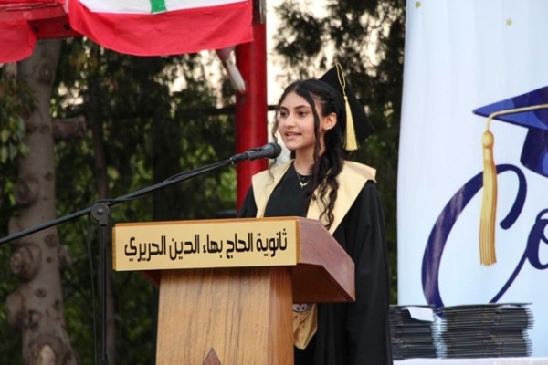 بعد دخول موكب الخريجين والنشيد الوطني وتلاوة عطرة من القرآن الكريم من التلميذ أسامة حنينة ، كان ترحيب من عريفي الحفل التلميذين حلا أبو علول واحمد أبو رقبة ، ثم جرى عرض فيلم عن الثانوية ، ألقى بعدها كلمة الخريجين الطلاب : تالا بدر الدين السوسي باللغة العربية ، ندى سليقا باللغة الإنكليزية وليا الرزة باللغة الفرنسية ، استحضروا فيها ما يحملونه من المدرسة من ذكريات جميلة وأصداءَ الحروف، وهمسَ الصّفوف، ودفءَ المقاعد، وصدى الخطى إلى حيث العُلا، وكيف مضوا سِرْبًا وَاحِدًا، يحَلِّقُون فِي فَلَكِ الدِّرَاسَةِ، وَكُلٌّ مِنَّهم طَائِر يُشَدِّدُ مِنْ جَنَاحِ الْآخَرِ، معبّرين عن سعادتهم الغامرة في يوم تخرجهم كأنّهم " في حديقةٍ ناطقة، وردها النّجاح، كبيرُها الطّموح، زهرُها الأحلامُ المتفتّحةُ على مهل، طيرُها مشاعرُ ترفرفُ عاليا، تغرّدُ بنبضِ القلب" وكيف ان هذَا الْحُلْمِ "صَارَ وَرْدًا، وَصَارَ لَهُ جَنَاحٌ" ، ومؤكدين أنهم سيبقون في "ثانويّةِ الحاجّ بهاء الدّين الحريريّ"، صَدًى فِي قُلُوبِ بعضهم البعض وفي مسيرة مدرستهم، ومقدمين الشكر والتقدير والعرفان "لِمَنْ زَرَعَ، وَمَنْ سَقَى، وَمَنْ صَبَرَ، لرئيسة الثانوية السيدة الحريري والمديرُ الأرناؤوط ورئيسةُ القسمِ المتوسط السّيّدة القطب والمُعَلِّمُينَ والأهالي .