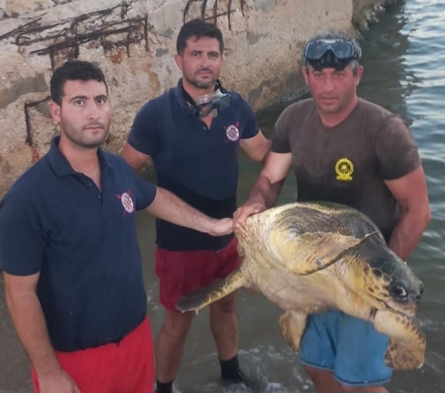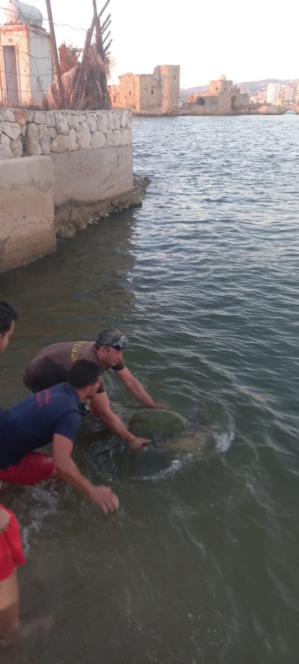 في خطوة إنسانية انقاذ سلحفاة بحرية عالقة في شباك داخل حوض ميناء صيدا من وحدة الإنقاذ البحري في الدفاع المدني