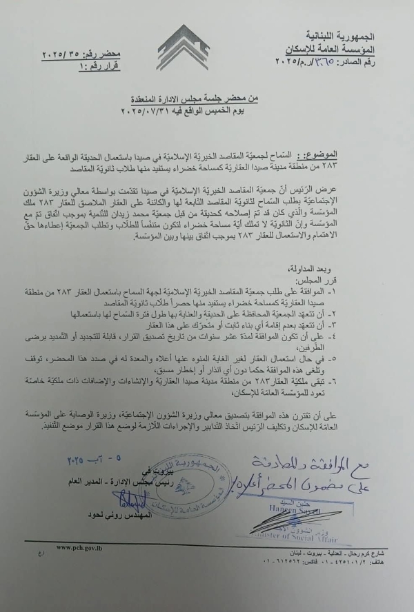 وقد صدر القرار الوزاري الذي يقضي باستعمال هذه المساحة حصراً لطلاب ثانوية المقاصد بما يعزز البيئة التعليمية والثقافية والصحية لطلابنا ويفتح أمامهم مجالاً رحباً للراحة والنشاط في بيئة طبيعية آمنة.