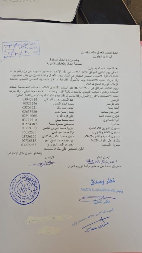 انعقدت يوم الإثنين بتاريخ جلسة لانتخاب مجلس تنفيذي جديد لاتحاد نقابات العمال والمستخدمين في لبنان الجنوبي، بحضور مندوبين عن وزارة العمل. وقد جرت العملية الانتخابية وفق الأصول القانونية وبحضور المجلس التنفيي للاتحاد، وأسفرت عن فوز لائحة بالتزكية.