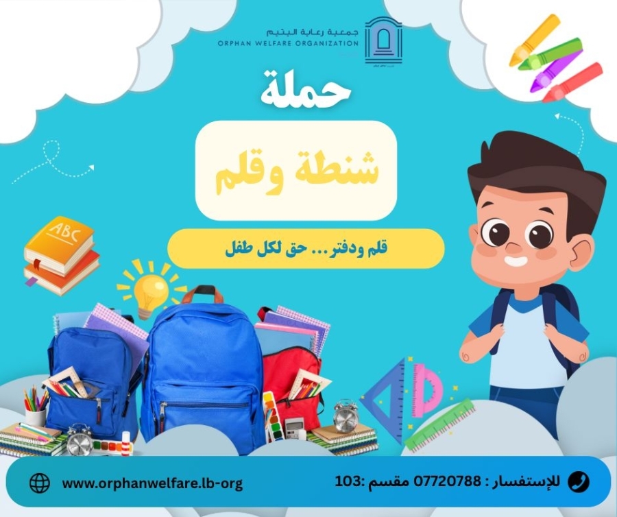 أطلقت جمعية رعاية اليتيم حملة "شنطة وقلم" لتأمين حقائب مدرسية وقرطاسية لـ 1200 طفل لـ"يبدأوا عاماً دراسياً مفعماً بالعلم والأمل ".