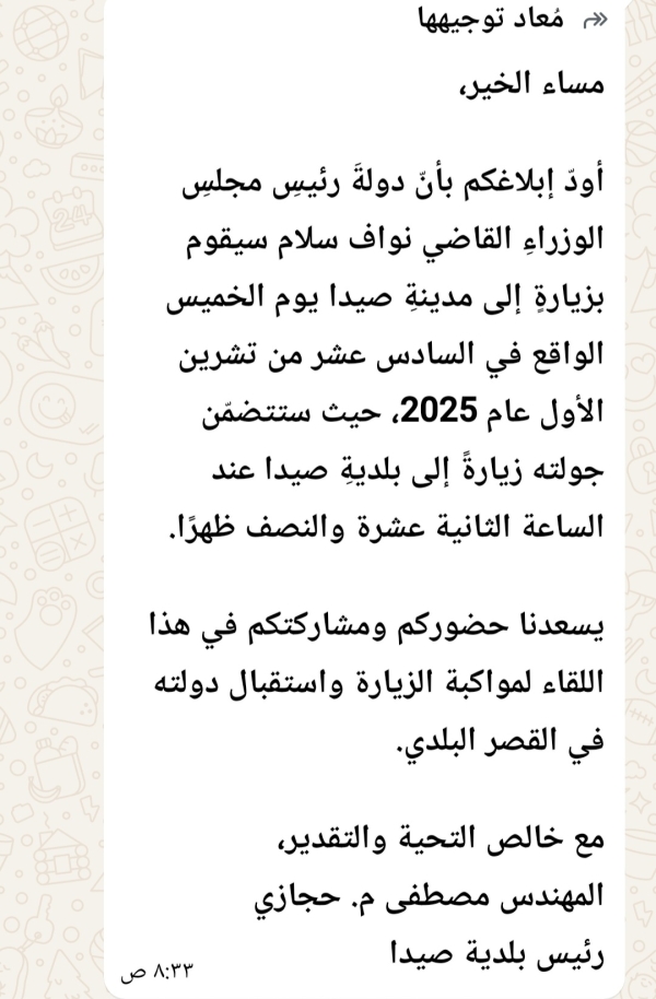 دولة رئيس نواف سلام يزور مدينة صيدا يوم الخميس، في محطة سياسية واجتماعية مهمة، حيث يُتوقع حضور كبير من مختلف الفعاليات السياسية والأهلية في المدينة. هذه الزيارة تأتي بدعوة رسمية من بلدية صيدا التي وجهت الدعوات عبر رسائل نصية شملت المجتمع المدني والقيادات السياسية.