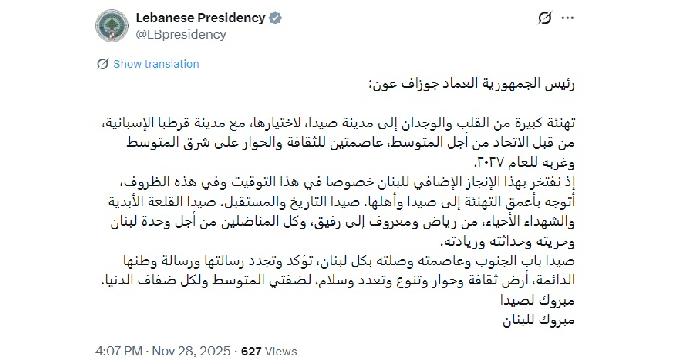 وجه رئيس الجمهورية العماد جوزاف عون "تهنئة كبيرة من القلب والوجدان إلى مدينة صيدا، لاختيارها، مع مدينة قرطبا الإسبانية، من قبل الاتحاد من أجل المتوسط، عاصمتين للثقافة والحوار على شرق المتوسط وغربه للعام ٢٠٢٧.