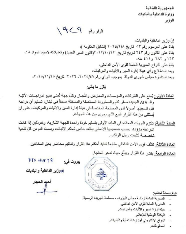 قرار وزير الداخلية والبلديات احمد الحجار حول منع شركات ومؤسسات ومعارض وتجار وكل جهة تُعنى ببيع الدراجات الآلية و/أو الـ ATV الجديدة منها و/أو المستوردة المستعملة في لبنان، تسليم أي دراجة قبل تسجيلها أصولًا لدى المصلحة المختصة في هيئة إدارة السير والآليات والمركبات وإلزامها بتسليم خوذة للجهة الشارية.