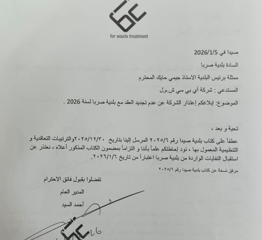 بعد سنوات من تراكم النفايات في عقارات بلدية صيدا، ومع استمرار محاولات شركة أي بي سي ادجل نفايات من خارج نطاق المدينة، جاء القرار الحاسم: منع الشركة من التقدّم بأي عروض ضمن مناقصات اتحاد بلديات جزين لنقل النفايات إلى صيدا.
