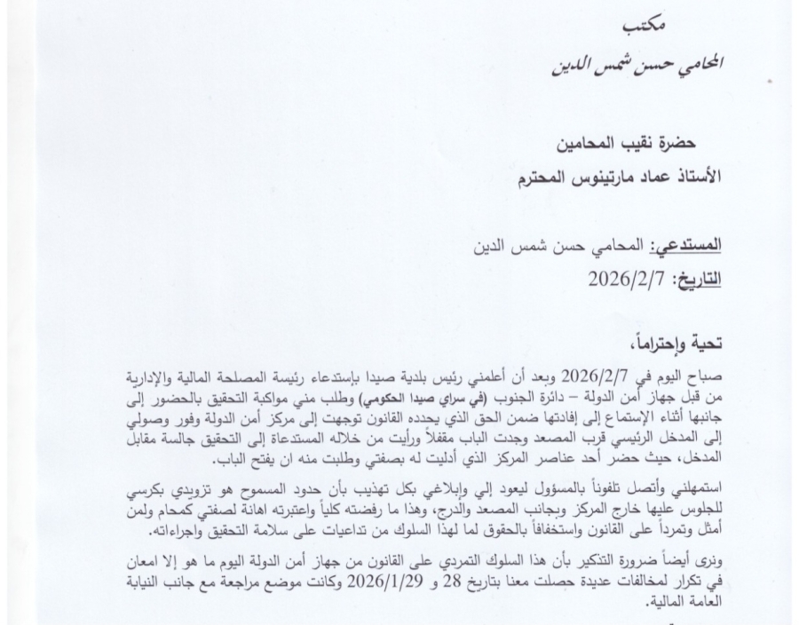 صباح اليوم في 7/2/2026 وبعد أن أعلمني رئيس بلدية صيدا بإستدعاء رئيسة المصلحة المالية والإدارية من قبل جهاز أمن الدولة – دائرة الجنوب (في سراي صيدا الحكومي) وطلب مني مواكبة التحقيق بالحضور إلى جانبها أثناء الإستماع إلى إفادتها ضمن الحق الذي يحدده القانون توجهت إلى مركز أمن الدولة وفور وصولي إلى المدخل الرئيسي قرب المصعد وجدت الباب مقفلاً ورأيت من خلاله المستدعاة إلى التحقيق جالسة مقابل المدخل، حيث حضر أحد عناصر المركز الذي أدليت له بصفتي وطلبت منه ان يفتح الباب.
