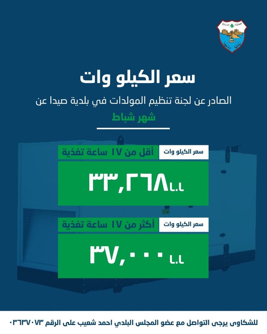 لجنة تنظيم قطاع المولدات في بلدية صيدا اصدرت بيان تكلفة الاشتراكات الكهربائية لشهر شباط 2026