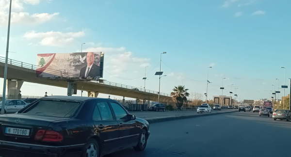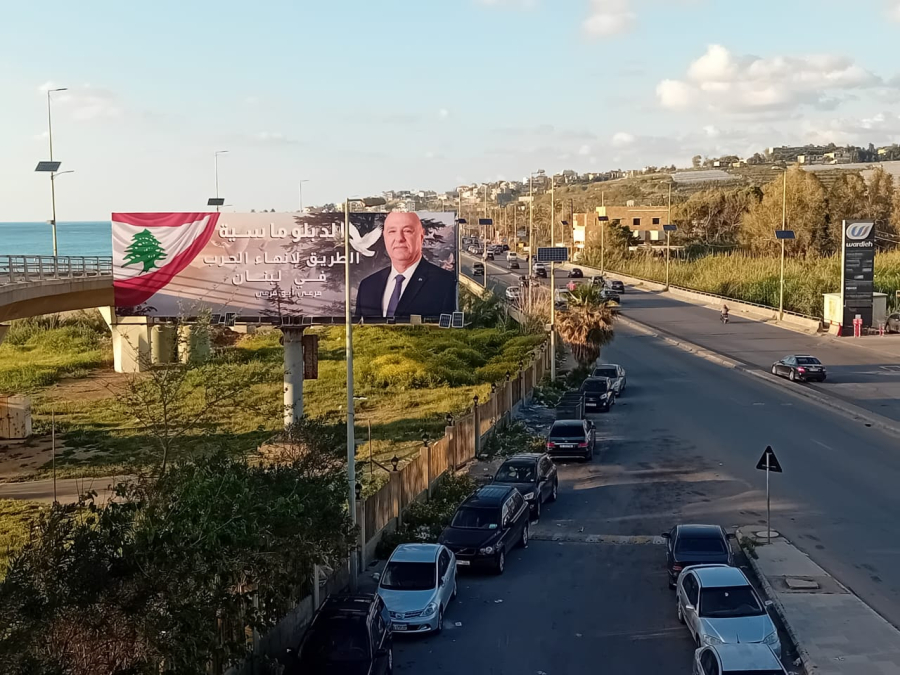 وقد تضمنت اللافتات صورة لفخامة الرئيس عون والعلم اللبناني وحمامة ترمز الى السلام وقد كتب عليها الدبلوماسية الطريق لانهاء الحرب في لبنان،