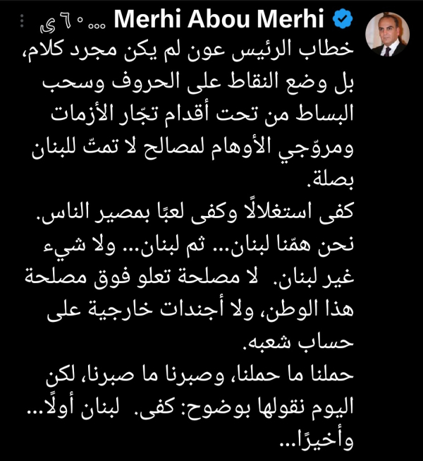 كفى استغلالًا وكفى لعبًا بمصير الناس. نحن همّنا لبنان… ثم لبنان… ولا شيء غير لبنان. لا مصلحة تعلو فوق مصلحة هذا الوطن، ولا أجندات خارجية على حساب شعبه.